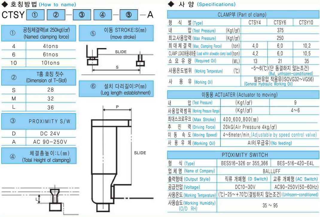 - CTSY는 NON-TOUCH CLAMP는 단동 SPRING 복귀형 CLAMP(SY형 HI-CLAMP)와 AIR식 ACTUATER를 조합한 상형용 이동식 CLAMP입니다.